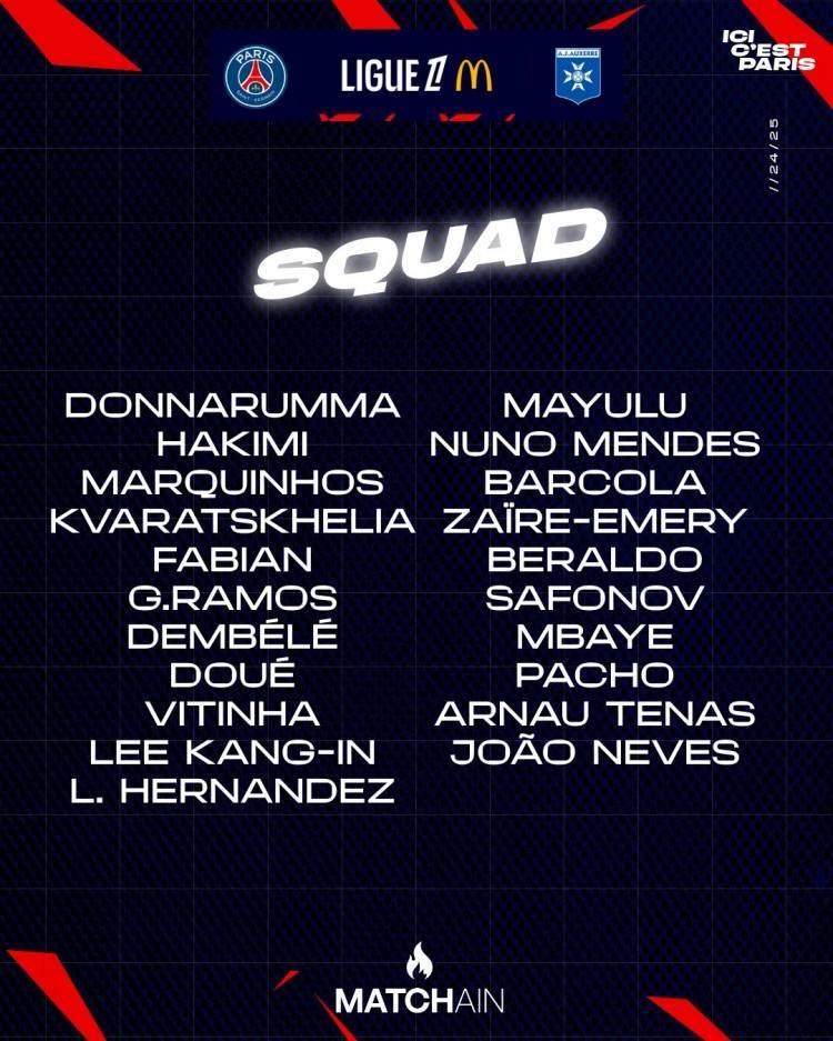 中场:法比安-鲁伊斯、维蒂尼亚、李刚仁、马尤卢、扎伊尔-埃梅里、内维斯