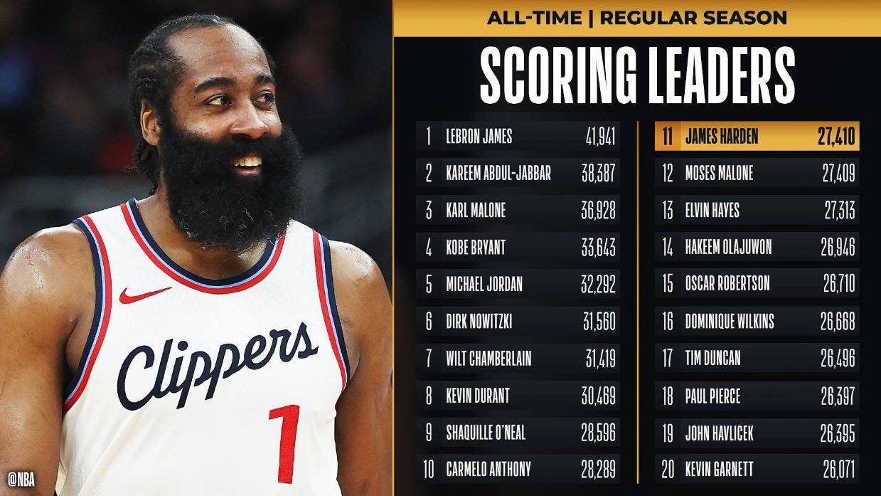 下半场,詹姆斯-哈登得到个人本场第12分,凭借这次得分,他的生涯总得分正式来到27410,超越摩西-马龙升至历史第十一位。